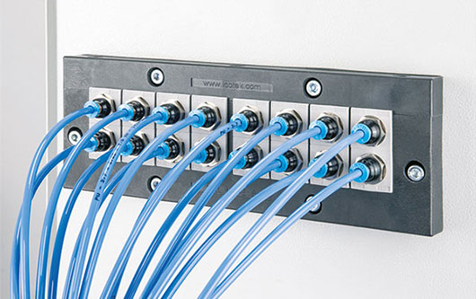 Teilbare Kabeldurchführungen und Kabelverschraubungen von icotek erm?glichen die schnelle, sichere und kostengünstige M?glichkeit, bereits vorkonfektionierte Leitungen (z.B. mehrpolige Leistungsstecker, Signalstecker, Sensorenstecker, Profibus, D-Sub…), aber auch pneumatische Schl?uche durch die Schaltschrankwand, den Schaltschrankboden oder das Schaltschrankdach einzuführen, mit bis zu IP66 / IP68 und UL Type 4X abzudichten und gleichzeitig nach EN 62444 gegen Zug zu entlasten.