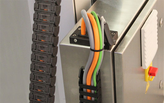 KEL-ER cable entry frames IP66: Routing and strain relief of supply and prefabricated control cables into the control box of a conveyor.