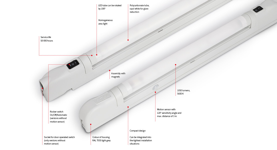 High Power LED valaisee 1050 lumenin teholla ja sen k?ytt?ik? on 50 000 tuntia. Opaalinvalkoinen polykarbonaattiputki antaa tasaisen, h?ik?isem?tt?m?n aluevalon.