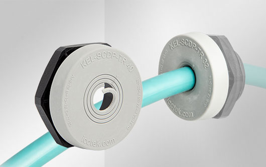 Je nach Leitungsdurchmesser lassen sich die Dichtrillen der Kabeldurchführungsplatte KEL-SCDP-TR auf den ben?tigten Dichtbereich sehr einfach absch?len. Die KEL-SCDP-TR verfügt über ein integriertes metrisches Gewinde von M25 bis M63. Hierdurch k?nnen Standardausbrüche wie für herk?mmliche Kabelverschraubungen verwendet werden.