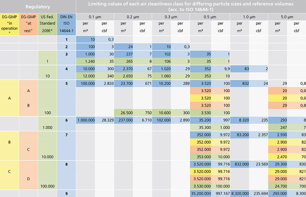 Cleanrooms are classified by classes according to ISO 14644-1 as per ISO 1 to 9. The individual cleanroom classes may only contain a certain number of particles of a specified size. The particle concentration is considered per m3 of air. ISO 1 contains the strictest specifications, for ISO 9 the lowest specifications.